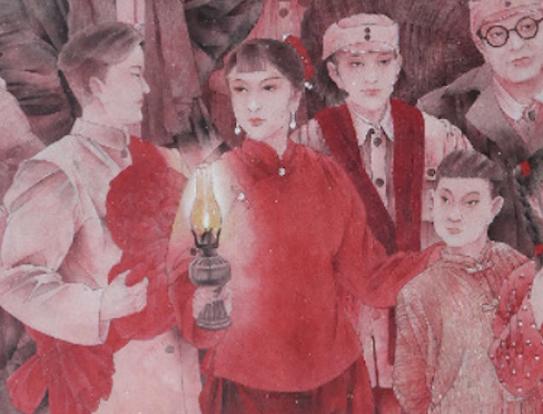 我以一个观者的视角,把现实和历史融合到了一起。现实中的那个儿童,代表的是新时代的希望和历史发展的基础,她与历史的触碰,通过和剧中小主人公的沟通,手与手形成了一个完美的心形。历史不是苍白的,红色历史更是有血有肉的,所以在画面当中,除了现实中的那个儿童,其余所有的人物,我都采取了以红色调为主的创作形式。在技法和材料的选择上,为了尊重历史的厚重,我采用了矿物质颜料的厚画法,用浓墨重彩的形式,把那一段真实的历史,用唯美的手法,转换成了一幅工笔重彩画。