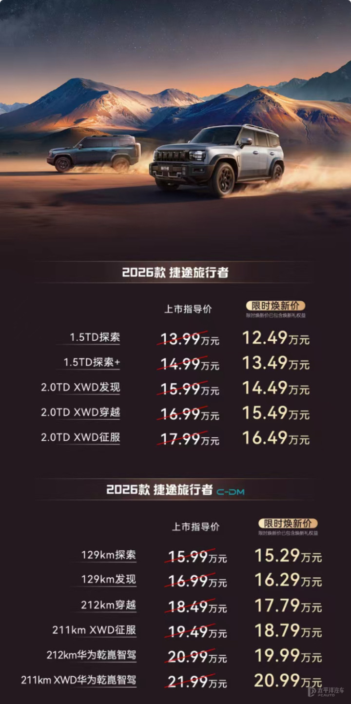 11月17日,在捷途汽车的旅行者之夜暨第四届旅行+大会上,2026款捷途旅行者(查成交价|车型详解)/旅行者C-DM正式上市,新车共推出了11款车型(旅行者5款,旅行者C-DM6款)。2026款旅行者官方指导价格为13.99-17.99万元,2026款旅行者C-DM官方指导价15.99-21.99万元,同时在享受置换补贴的情况下享有限时焕新价。此次捷途山海T2正式更名为旅行者C-DM,也是回应了众多用户的建议将山海T2归入旅行者系列的声音弘益配资,这对于打造捷途旅行者的综合影响力也有很大的帮助。